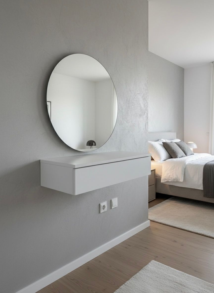Redéfinissez votre espace de préparation avec notre coiffeuse suspendue au design contemporain. Conçue pour libérer l'espace au sol, cette console murale apporte une sensation de grandeur et de clarté à votre pièce. Son grand miroir circulaire crée un point focal luxueux tout en reflétant la lumière naturelle de votre intérieur.